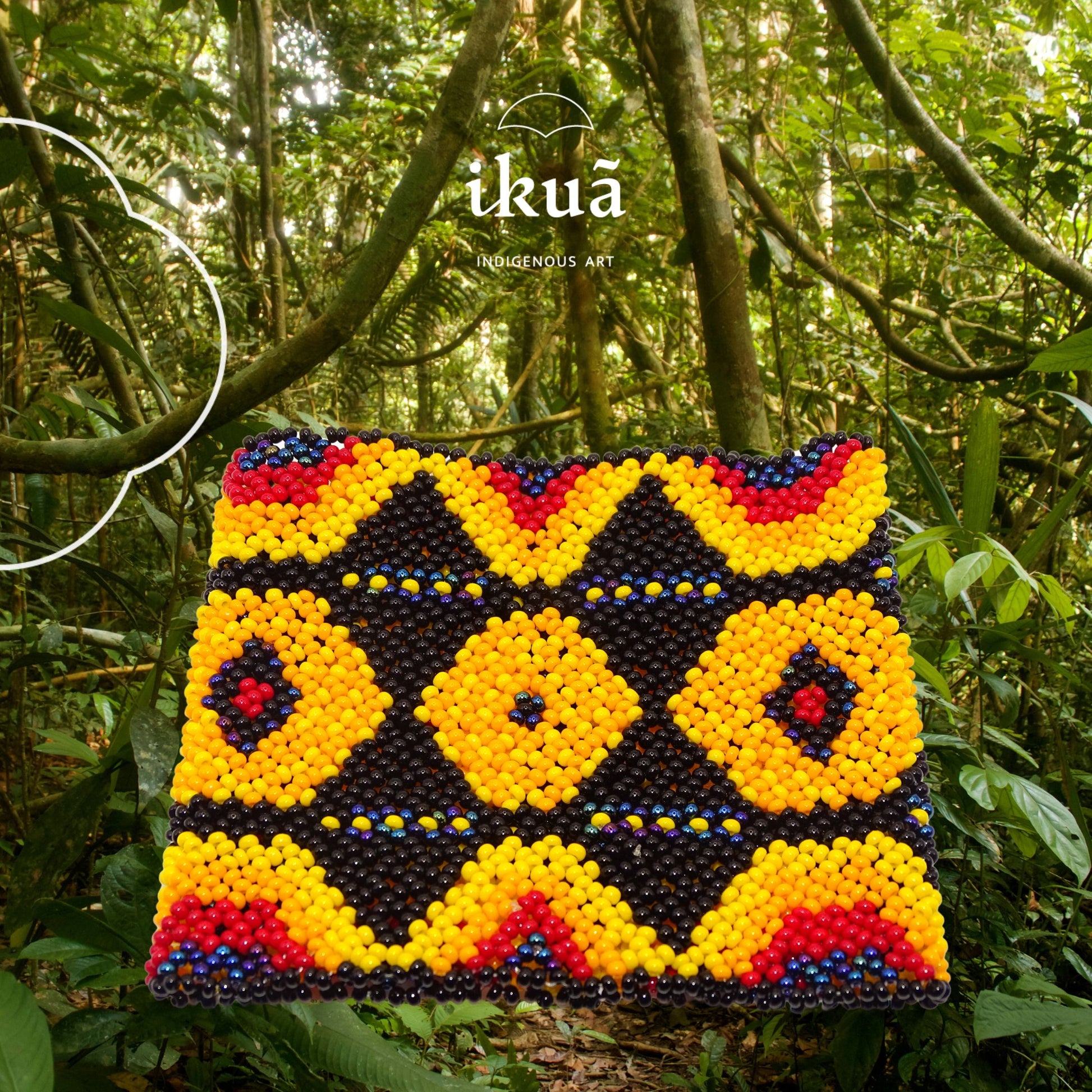 💚 Von den Huni Kuin traditionell handgefertigt 💚 Sonnen-Rauten-Design mit kosmischer Symbolik 💚 Strahlende Farbkombination aus Gelb, Schwarz und Rot 💚 Maße: 9 × 8,5 cm