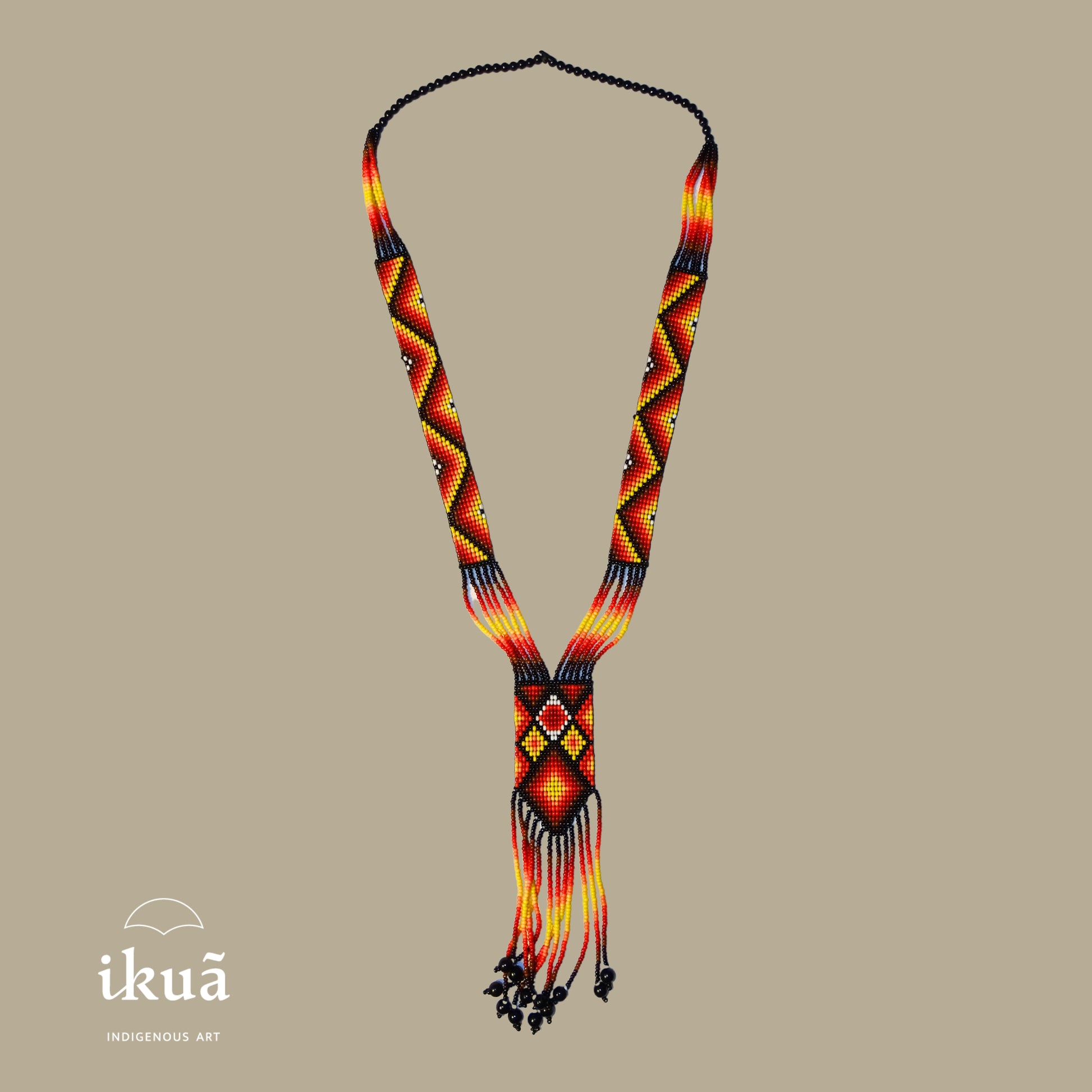 Entzünde deine innere Flamme und trage die unbändige Kraft des Sonnenfeuers an deinem Herzen. Diese glühende Perlenkette ist ein von den Puyanawa-Frauen in Brasilien handgefertigtes Amulett, das die Essenz von purer Energie und schöpferischer Leidenschaft verkörpert.