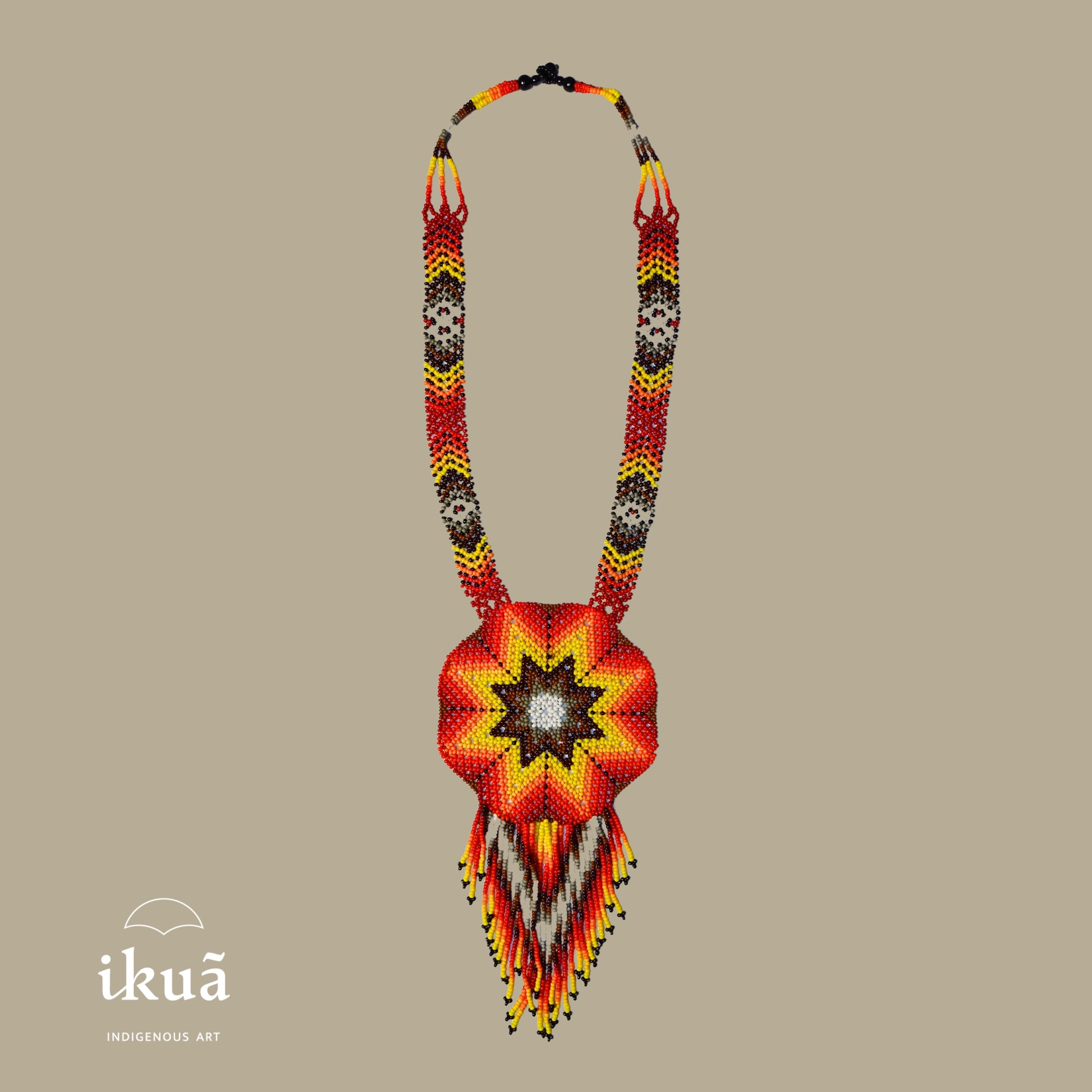 Kanalisiere die pure Energie der Sonne und trage ihr strahlendes Licht direkt an deinem Herzen. Diese imposante Perlenkette ist ein von den Puyanawa in Brasilien handgefertigtes Meisterwerk, das die lebensspendende Kraft des Himmels und der Erde vereint.