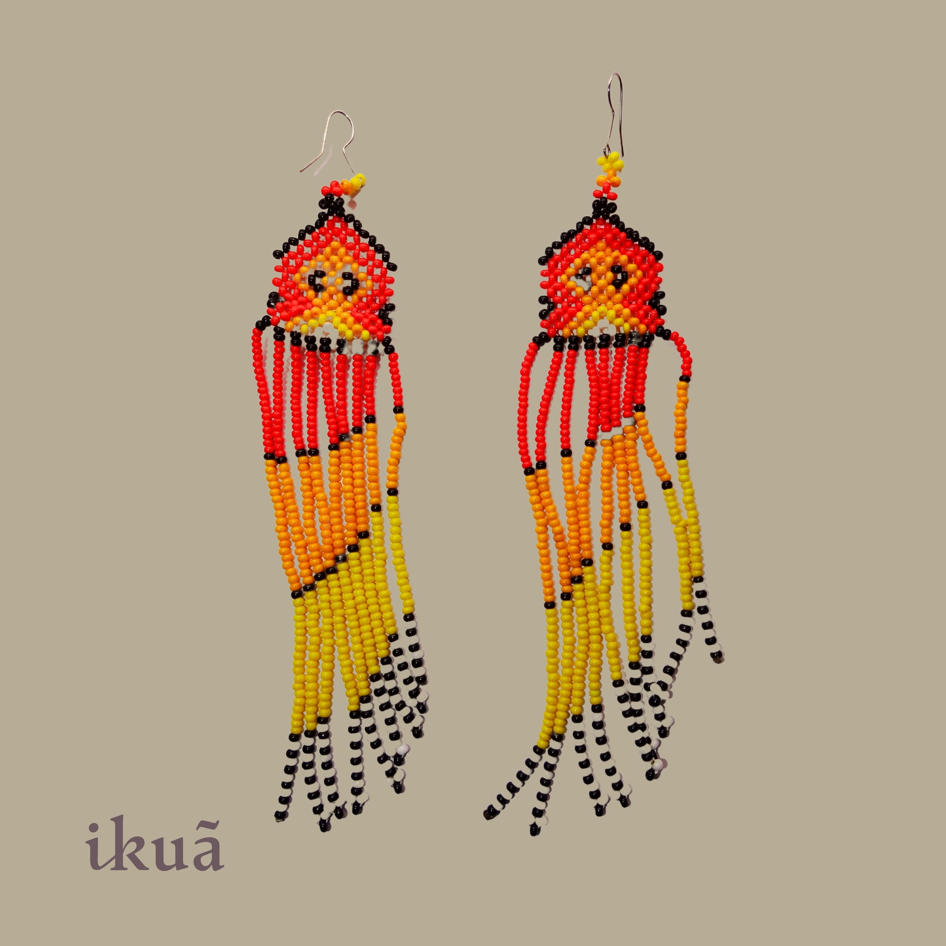 Trage das Antlitz des heiligen Feuers und lass seine kreative Energie durch dich fliessen. Diese eindrucksvollen, von den Huni Kuin in Brasilien handgefertigten Perlenohrringe sind mehr als nur Schmuck – sie sind machtvolle Amulette der Transformation.