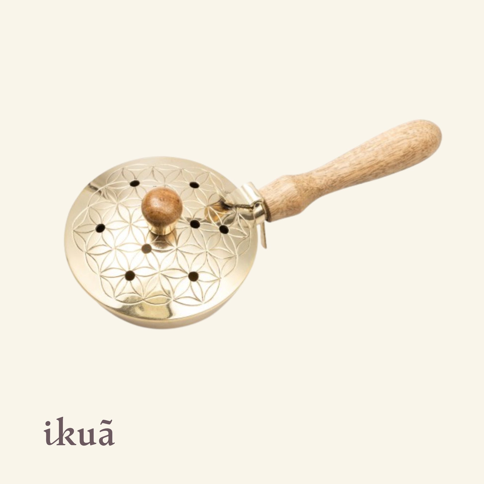 Das Herzstück der Pfanne ziert das mächtige Motiv der Blume des Lebens, welche Harmonie, perfekte Ordnung und die universelle Verbundenheit symbolisiert. Die Pfanne ist auf die intensive Reinigung mittels Räucherkohle ausgelegt und eignet sich perfekt, um Räucherwerk durch den Raum zu tragen und so Belastungen effektiv zu vertreiben. Der naturfarbene Holzgriff und der Holzknopf bieten sicheren Halt und Schutz vor der Hitze während des Rituals.