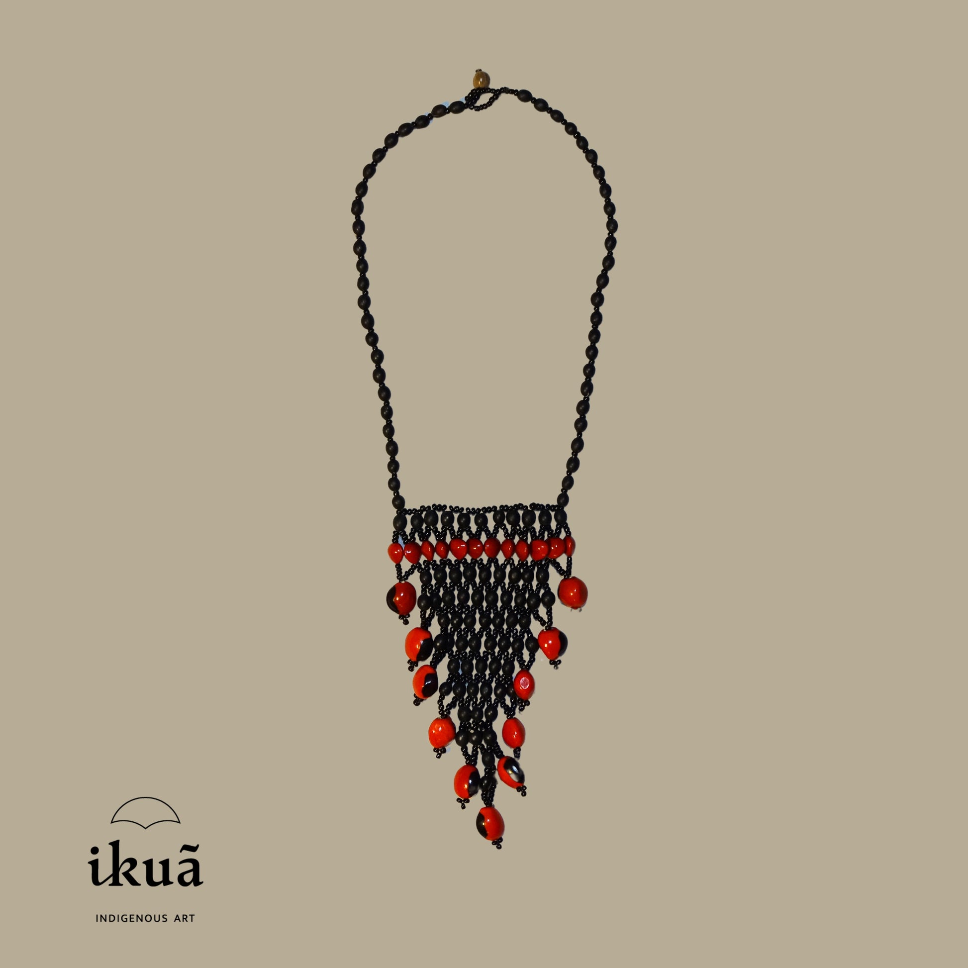 Dieses Collier wurde von Mama Mika, einer respektierten Shipibo-Schamanin im Ani Shinan Zentrum in Peru, persönlich erschaffen. Das kunstvolle schwarze Netz symbolisiert den Schutz der Erde und der spirituellen Welt. In diesem Netz gefangen, leuchten die heiligen roten Huayruro-Samen wie Tropfen reiner Lebenskraft. Sie sind die Essenz der Vitalität und des Glücks, gehalten und beschützt von der gewebten Intention der Schamanin.