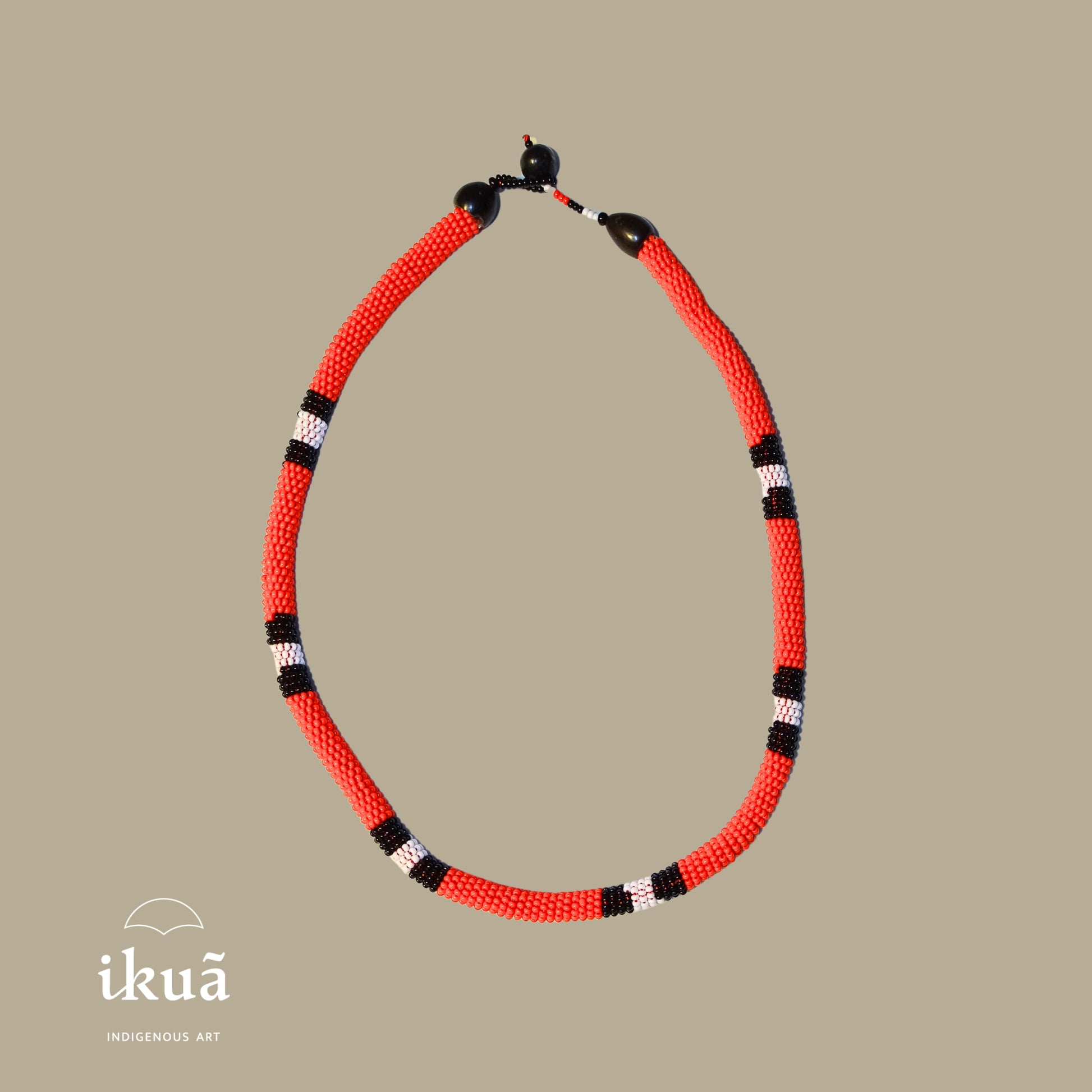 Diese Kette repräsentiert die Jiboia, die heilige Regenbogenschlange – eine der mächtigsten spirituellen Wesen im Kosmos der Xingu-Völker. Das leuchtende Rot symbolisiert die Lebenskraft und das Blut der Erde, während die schwarz-weissen Bänder die heiligen Muster ihrer Haut darstellen – ein Symbol für Transformation, Heilung und die unendlichen Zyklen des Lebens. Es ist ein Amulett, das die Stärke und Weisheit dieses Urgeistes kanalisiert.